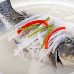 1、鲤鱼去鳞、鳃、肠肚后,洗净擦干,下油锅煎至金黄,加四碗水及姜酒,用大火烧开,转小火慢炖至奶白色。