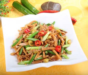 3、取砂罐放姜丝加水,下入干墨鱼丝、五花肉丝、河蚌肉、饭豆小火炖1小时至烂,加盐、味精调味,放胡椒粉,撒葱花,原罐上桌即成。