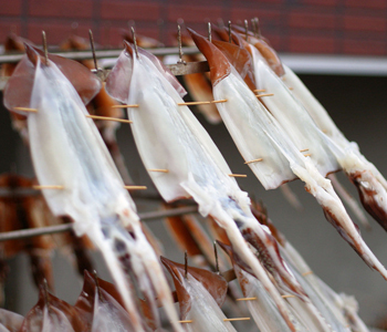 二看色泽:优质鱿鱼干微透红色,无霉点;嫩鱿鱼色泽淡黄,透明、体薄,老鱿鱼色泽紫红,体形大。劣质的鱿鱼干则色深暗,白霜过厚,不透明,背部呈黑红色或暗灰色。