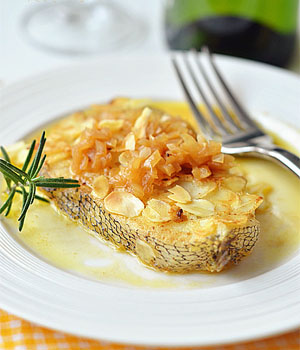 食材:鳕鱼2块,洋葱 20g,鸡蛋1个,杏仁片,柠檬1小块。