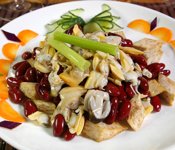 花甲肉+百合+玉竹+淮山药:同煮汤食用,可治口干、干咳、心烦、手足心热等症。