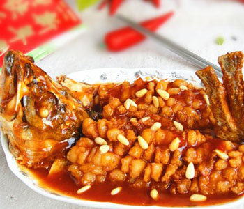 11、用水淀粉勾芡后熄火,淋在鱼肉上,撒上松仁即可。