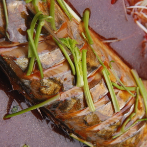 11、原汁用水淀粉勾芡,淋明油,出锅浇在盘中鲅鱼段上即可。