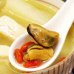 做法:淡菜干用清水加些黄酒浸泡至发软,去除内脏等并冲洗干净待用;豆腐切块,葱切片,姜切丝,山药去皮切条,锅入油烧热,爆香葱姜,加入淡菜稍炒一会,再入加高汤、黄酒、白醋、糖大火煮开,下入豆腐、山药条用中小火煮20分钟左右,最后加入洗净的枸杞煮5分钟左右,加鸡精调匀即可。