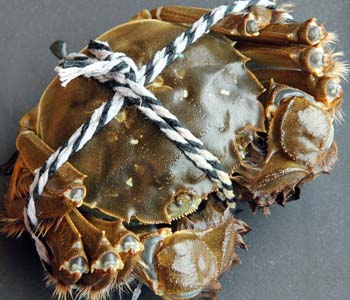 也可通过其“横行”来观察,爬行时肚腹离地者就是好货。当然,其蟹足均被绑住,那就不在此列了。不过,还可看蟹是否反应灵敏,若用手或枝条触动其眼睛旁边时,眼珠子会灵活闪动,反应敏捷,或者会“口喷白泡”者,还是够生猛和新鲜的。