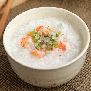 材料:白米1杯,干贝3粒,鸡胸肉150克,香菇4片,马蹄5粒,葱花少许