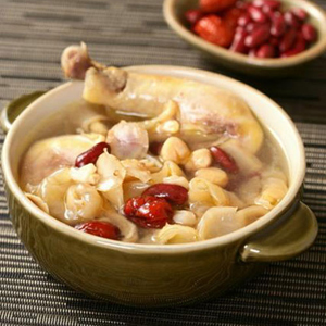 材料:乌骨鸡200公克,干贝20公克,绿竹笋120公克,泡发香菇20公克,姜片,盐,鸡粉