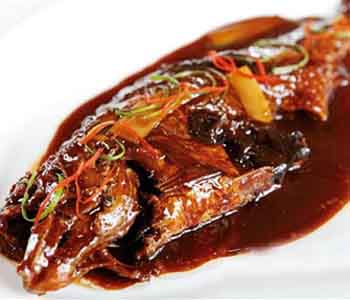 7、放入煎好的黄鱼,加入酱汁中火煮;煮开后转小火,煮至酱汁浓稠即可关火,盛出后撒上红辣椒作为点缀。