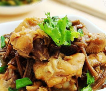 材料:全鸡、干茶树菇、姜、葱、八角、花椒、酱油、白糖、盐、香菜