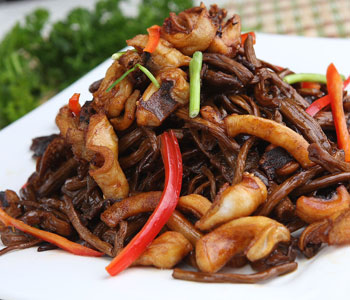(4)放入茶树菇翻炒,加入白糖,酱油继续翻炒,炒匀后加入能没过所有食物的开水;
