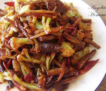 材料:花菜、新鲜茶树菇、姜、干红辣椒、豆瓣酱、酱油、盐、孜然粉、红椒粉