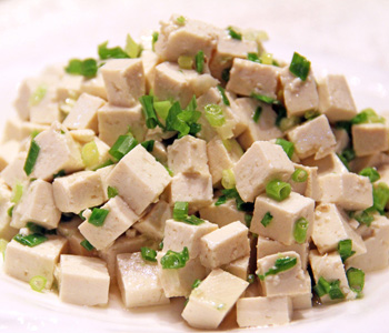 制作食材:豆腐300克、葱30克、精盐5克、味精3克、香麻油4克、精制油30克