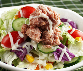 5、先淋一些金枪鱼罐头里的汁,然后加入沙拉酱,黄芥末,柠檬汁搅拌均匀,淋在沙拉上即可