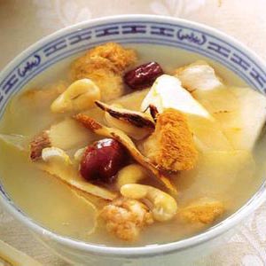2、将猴头菇、瘦肉、姜片一起放入炖盅里面,加入四碗清水,炖两个小时,然后加入食盐调味即可。