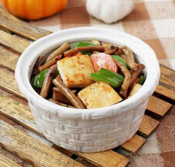 做法:1 茶树菇泡软洗净切段,青椒切片,红椒切碎,豆腐切块。
