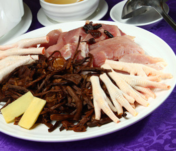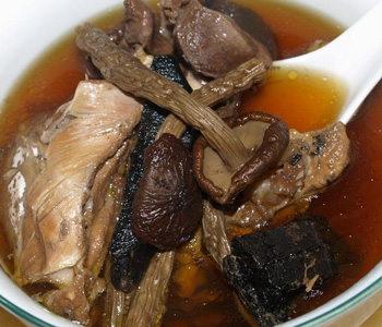 材 料:乌骨鸡半只、干燥茶树菇50g、当归1片、红枣10粒、蒜头10粒