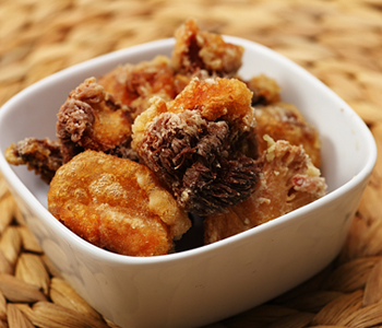 ③炒锅烧热注入油三杯,以中火烧至六成热后,将做法1沥干的猴头菇沾裹干面粉入油锅炸至金黄色即可捞起沥油;