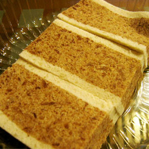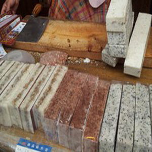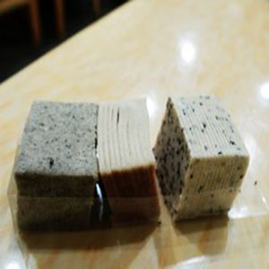 3、装盆、开切。用盆框套上盆底,将擦好的糕坯粉装入盆内,用手刨匀,再用铁梳刮平,铜压子轻轻压紧,不宜过紧,开成长方块形,长方形大小可以根据自己的食量或者是爱好。取出盆框,放置约一个小时,使糕粉涨润凝结,再用彩印纸逐封包装,即为成品。尽量做到厚薄均匀,整齐方正。