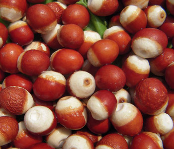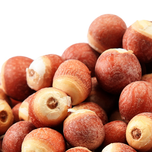 芡实果实是圆球形的,直径5-8mm,有的破碎成块。完整者表面有红棕色或暗紫色的内种皮,可见不规则的脉状网纹,质地较硬,断面白色,粉性。没有什么特殊气味,吃起来味道淡淡的。购买芡实果实以饱满、断面白色、粉性足、无碎末者为佳。