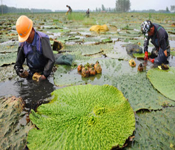 芡实是睡莲科芡属一年生大型水生草本,分布于我国大部分地区。芡实的外形是沉水叶箭形或椭圆肾形,长4-10厘米,两面无刺;叶柄无刺;浮水叶革质,椭圆肾形至圆形,直径10-135厘米,盾状,有或无弯缺,全缘,下面带紫色,有短柔毛,两面在叶脉分枝处有锐刺;芡茎三月生叶贴在水面上,比荷叶大,有皱纹,叶面呈青色而背面呈紫色,茎、叶都有刺。茎长达一丈余,中间也有孔有丝,嫩对剥皮可食。芡实五六月开紫花,花在苞顶,也如鸡喙。剥开后有软肉裹子,壳内有白米,形状如鱼目。芡实七八月成熟,九月份结果。芡实全身有刺,采收困难,一般只收1~2次,采收时间为9月中、下旬。