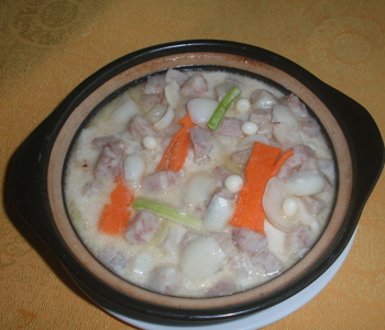 百合芡实煲是指将鲜百合与鲜芡实加入芋头等共同熬煮而成的一道菜肴。汤色清淡纯白,闻起来有一股淡淡的奶香味,新鲜的芡实煮熟后口感软糯异常,祛湿消火,素雅的鲜百合使得整道菜更加清香,带着点脆感,吃起来非常爽口。