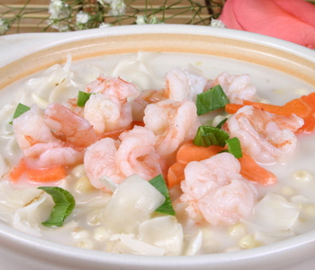 材料:鲜百合80g,小芋头100g,芡实20g,胡萝卜1根,香芹茎1根,鲜虾仁4只,盐1茶匙,高汤800ml,油20ml