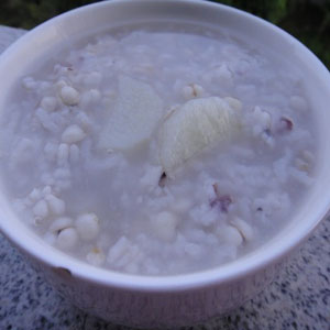 山药薏米芡实粥由山药、薏米和芡实三种食材构成的一款粥。山药有滋阴养身的功效,含有丰富多糖,长吃山药,可以身强体健。薏米补中益气。芡实有收敛的作用,治疗久泻不止,小便不禁,腰膝痛,女子赤白带下。常吃芡实可以增长寿命,增加体质。总的来说山药薏米芡实粥有以下的功效: