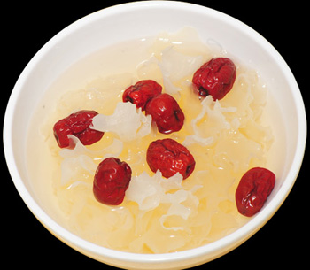 做法:银耳泡发洗净,去蒂撕小朵,放入沸水锅中煮至熟烂,然后加入红枣、冰糖继续煮,待所有食材熟透之后,关火焖一小会,即可食用。