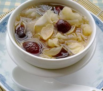 做法:银耳泡发去蒂撕小朵,红枣洗净去核。然后将银耳放入沸水锅中煮至熟烂,放入红枣,煮约10分钟。再放入陈皮,煮10分钟,最后加入冰糖并打入鸡蛋,搅拌均匀即可。