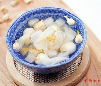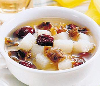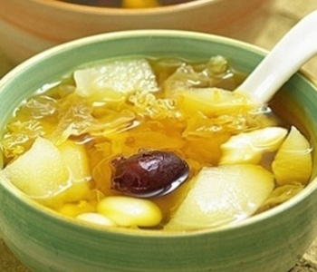 银耳作为一种食材,营养相当的丰富,银耳又称作白木耳、雪耳、银耳子等,属于真菌类银耳科银耳属,是门担子菌门真菌银耳的子实体,有“菌中之冠”的美称。银耳子实体纯白至乳白色,直径5~10厘米,柔软洁白,半透明,富有弹性。其味甘、淡、性平、无毒,既有补脾开胃的功效,又有益气清肠、滋阴润肺的作用。既能增强人体免疫力,又可增强肿瘤患者对放、化疗的耐受力。银耳富有天然植物性胶质,外加其具有滋阴的作用,是可以长期服用的良好润肤食品,而雪梨与银耳相搭配,就构成了一种富含营养元素的甜品。加热过的梨汁含有更大量的抗癌物质—多酚 “梨和加热过的梨汁,都有加速排出体内致癌物质的功能。”银耳雪梨汤能清火止咳,具有养颜美容的功效,老少皆宜,此汤也适合孕妇饮用。