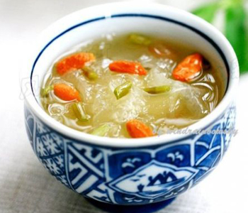 众人皆喜爱食用银耳羹的原因不仅仅是因为其美味,看起来清爽可口,还因为其有着更多的功效作用。银耳羹中添加的有莲子、红枣等配料。莲子性平、味甘涩,有益心、补肾、止泻、固精、安神之效。大枣性温、味甘,其维生素含量为水果之冠。每百克鲜枣所含维生素C的量为柑桔的8-17倍,为香蕉的50-100倍,为苹果的50倍,有活维生素丸之称。有益气补血、健脾和胃、补血脏、治虚损、以及抗癌防癌之功效。银耳羹有较强的滋补健身功能,是传统的润肤养颜佳品。