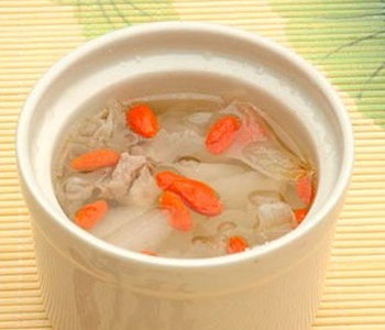 做法:1、把瘦肉清洗干净,并切成小块,并放入热水中焯一下,去掉血腥味,然后放进一边备用。2、把雪梨去皮去核,切成大块。3、银耳用泡软,然后掰成小块备用。4、把焯好的瘦肉、切好的雪梨和掰好的银耳放入炖盅内,加入清水,淹没过所以原料即可。5、盖上盖子,放入蒸锅内蒸30分钟。6、然后打开盖,放入枸杞和盐,喜欢吃甜的朋友可以改放冰糖,然后再蒸5分钟就可以食用了。