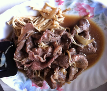 原料:肥牛片、金针菇、葱、姜、胡萝卜、蚝油、料酒、酱油、白胡椒粉、食盐。