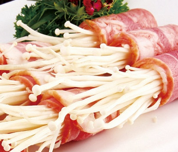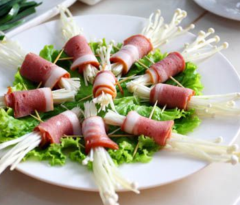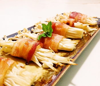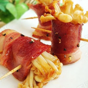 培根含有脂肪和胆固醇,而金针菇可以有助于脂肪和胆固醇在体内的消耗,所以培根金针菇卷是一道美味的健康菜式。