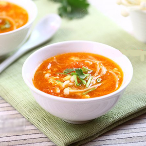 4、金针菇鲜美嫩滑,由于它非常易熟,久煮会易老,应将番茄汤调好味后,才放入金针菇煮软即成。