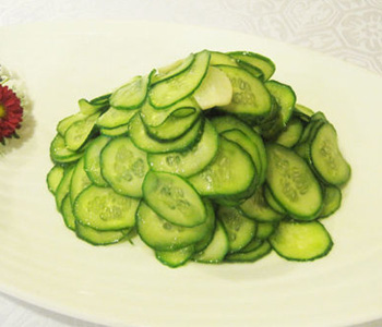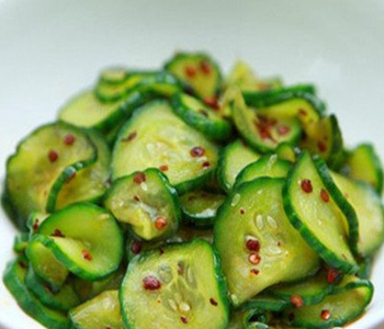 黄瓜500克,精盐、白糖、白醋各适量。先将黄瓜去籽洗净,切成薄片,精盐腌渍30分钟;用冷开水洗去黄瓜的部分咸味,水控干后,加精盐、糖、醋腌1小时即成。此菜肴酸甜可口,具有清热开胃,生津止渴的功效,适用于烦渴,口腻,脘痞等病症,暑天食之尤佳。