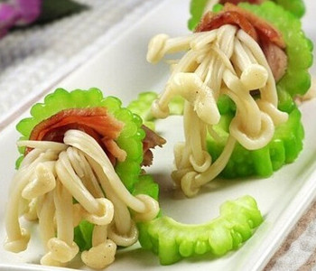 4、取一片培根放入盘中,取一撮金针菇放在培根上,从一头卷起来,再把卷好的培根卷塞入苦瓜圈中即可。