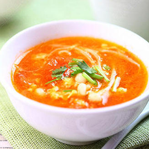 材料:瘦肉(130克)、番茄(3只)、金针菇(50克)、鲜木耳(50克)、香菜末(1汤匙)、蒜蓉(1/2汤匙)。