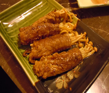 ②用肥牛片把金针菇和切好的青红椒丝包裹起来;