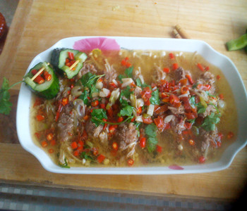 ④将锅中的配料渣取出,留下煮好的酸辣汤,放入肥牛片煮至变色即可捞出