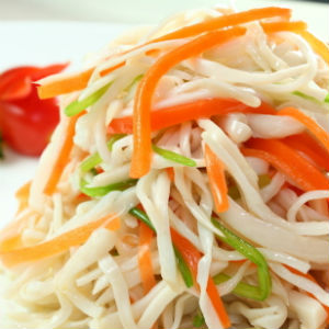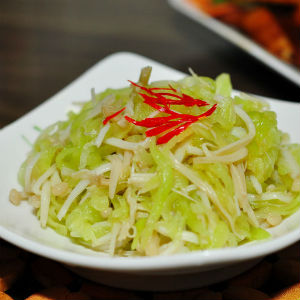 金针菇为真菌植物门真菌冬菇的子实体,营养丰富,清香扑鼻。其菌盖小巧细腻,黄褐色或淡黄色,干部形似金针,故名金针菇。金针菇既是一种美味食品,又是较好的保健食品。金针菇能有效地增强机体内的生物活性,促进体内新陈代谢。它不仅口感滑嫩、味道鲜美,而且营养非常丰富,其中含锌量比较高,有促进智力发育和和健脑的作用。而凉拌金针菇是一道简单的快手菜,清爽适口但又不失鲜美。下面就跟随小编一起学习凉拌金针菇的做法吧。