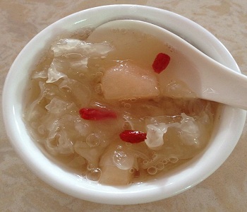 如果是将银耳雪梨汤作为治疗肺热有痰症状的治疗食物的话,在制作时,可以将雪梨掏空心,把银耳和冰糖放入雪梨空心中,蒸一个小时。虽然有时梨皮的口感不好,但是不建议去皮,因为营养都在梨皮上呢!