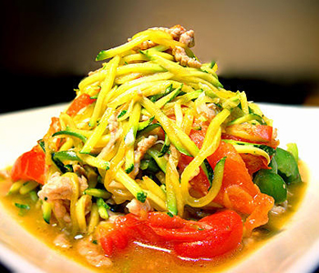 材料:嫩南瓜250克,猪肉丝45克,姜片15克,植物油、酱油、盐、葱末各适量。