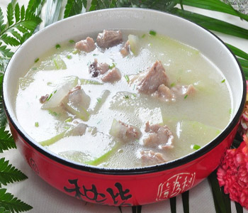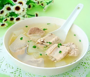 排骨冬瓜味道清淡,利于清热,是夏日的美味汤品。排骨冬瓜汤主要原料是排骨、冬瓜。猪排骨除含蛋白、脂肪、维生素外,还含有大量磷酸钙、骨胶原、骨粘蛋白等,为女人较好地补充钙质。冬瓜性凉而味甘,能消热解毒、利尿消肿,止渴除烦,对痰积、痘疮肿痛、口渴不止、烦躁、痔疮便血、脚气浮肿、小便不利、暑热难消等现象有效。