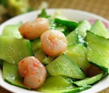 黄瓜500克,精盐、白糖、白各适量。先将黄瓜去籽洗净,切成薄片,精盐腌渍30分钟;用冷开水洗去黄瓜的部分咸味,水控干后,加精盐、糖、腌1小时即成。此菜肴酸甜可口,具有清热开胃,生津止渴的功效,适用于烦渴,口腻,脘痞等病症,暑天食之尤佳。