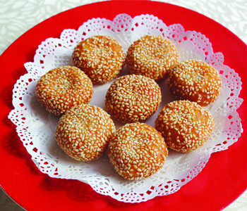 原料:糯米粉100克、澄粉50克、南瓜100克、红豆沙150克、白芝麻80克、黄油10克、白砂糖20克。