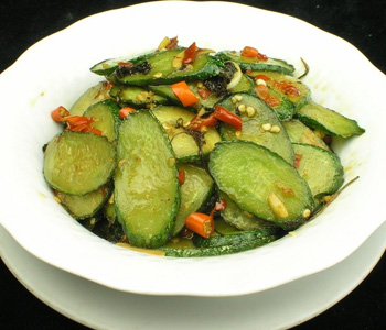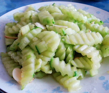 黄瓜500克,精盐、白糖、白醋各适量。先将黄瓜去籽洗净,切成薄片,精盐腌渍30分钟;用冷开水洗去黄瓜的部分咸味,水控干后,加精盐、糖、醋腌1小时即成。此菜肴酸甜可口,具有清热开胃,生津止渴的功效,适用于烦渴,口腻,脘痞等病症,暑天食之尤佳。