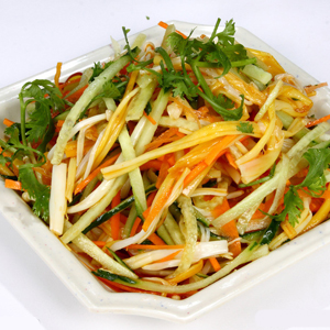 黄瓜:蓑衣黄瓜属于家常菜谱,黄瓜味甘性凉,富含水分和多种矿物质,具有清热、利尿、解毒的功效,对除湿、润肠、镇痛也有明显效果。
