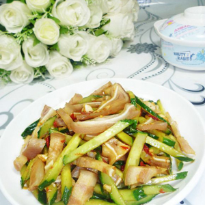 食材:黄瓜、猪耳朵、油、盐、姜、蒜。