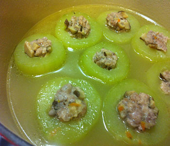 7、再将泥鳅放入炒锅,然后加水至淹没泥鳅,再放入黄瓜,加酱油和耗油后加盖炖汤